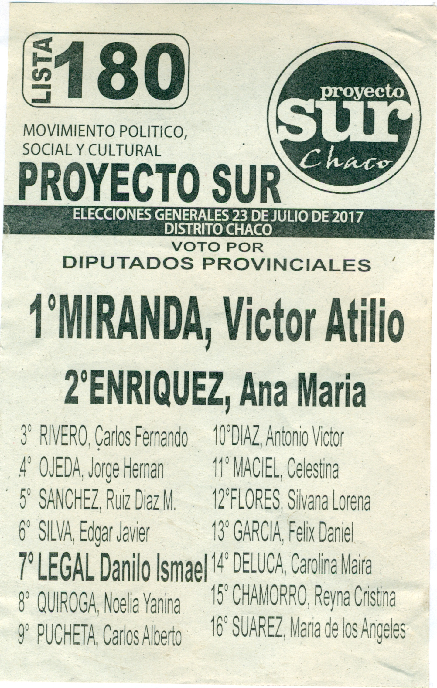 | 180 | MOVIMIENTO POLÍTICO, SOCIAL Y CULTURAL PROYECTO SUR | PARTIDO | ||